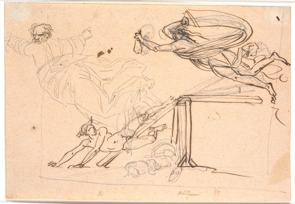 Curator: Here we have a pencil drawing from 1809 by Nicolai Abildgaard titled "The Catholic or Protestant Religion. A Seated Female Figure", held at the SMK, the National Gallery of Denmark. Editor: At first glance, it feels like a phantom, a faded echo. You can barely make out the details, and the woman seems to be fading into the background. Yet, there's an undeniable sense of monumentality in her seated posture, an almost spectral gravitas. Curator: Exactly. Although a preliminary sketch for what would be a history painting, this drawing already contains layers of symbols. Notice the central female figure, perhaps representing religion itself. She's flanked by what appear to be altars or tables bearing religious objects. Editor: The objects are fascinating. They seem hastily rendered, yet full of meaning. A vessel on one side, some books or perhaps implements of ritual on the other. This contrast speaks volumes. Vessels often relate to female symbols, life and the mother archetype. How is this read here? Curator: It's an invitation to interpret the differences, wouldn't you agree? Catholicism, traditionally rich in ceremony and objects, versus a more text-centered Protestantism. What does it say about how these religions conceptualized "feminine" ideas? I see a play of density against sparseness, of ornamentation versus utility. Editor: And it begs the question: what does it mean to see religion itself embodied as a woman in this historical context? Is it reverence, critique, something in between? Curator: Considering Abildgaard's Neo-Classical style and historical context, one can argue that he likely aimed to elevate the subject, drawing parallels between religious concepts and classical ideals of beauty and wisdom. The drawing, even unfinished, tries to use those old visual codes to negotiate and communicate an idea, though its success can be argued. Editor: The impermanence of the drawing actually accentuates this. It isn't a set image. Everything could shift if he had committed to it and made a complete, "finished" work. But the symbol becomes even more malleable. Curator: Indeed, there is a tentative quality to this piece, isn't there? It suggests Abildgaard was exploring and refining his ideas and visual representations. A record of the very process of image-making. Editor: An echo that keeps reverberating… the questions it raises feel startlingly relevant even now.
