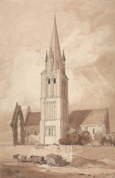 Curator: Here we have Hendrik Spilman's etching of "De St. Plechelmuskerk te Oldenzaal," created in 1734, baroque in its enduring and imposing aesthetic, now held here at the Rijksmuseum. Editor: My initial feeling? The looming tower dominating the relatively flat landscape, it evokes a real sense of historical weight, doesn't it? The texture of the etching adds a certain gravitas. Curator: Indeed. That tower, so meticulously rendered with its layered details, does carry immense symbolic value. In Northern European iconography, the church tower often acts as a visual metaphor for steadfast faith and communal identity, acting as a guidepost or even a safehold within. Editor: It's interesting you mention identity. Etchings like these, reproduced and distributed, would have played a key role in shaping and standardizing how people visualized their towns, right? They were propagating a visual and institutional power dynamic, I would suggest. Curator: Absolutely. Moreover, the delicate rendering hints at the impermanence of material reality set against eternal spiritual truths. The contrast in tone suggests a constant interplay between the terrestrial and celestial realms. It might imply the transience of earthly life in opposition to divine eternity. Editor: But that contrast could equally reflect the social anxieties of the time. I see it capturing that balance of everyday existence against the monumental and ever-present authority of the church as both a physical and controlling presence. The common folk are there, but small compared to it. Curator: That is insightful; perspective shapes the view. For me, beyond simple record-keeping, the artist consciously manipulates symbolic cues to engage the viewer in a discourse of belief, perhaps with some sense of longing for permanence within baroque flamboyance. Editor: I concur. But consider also that these "beliefs" weren't necessarily uniform. This image served, undoubtedly, a social function for audiences in Oldenzaal. Curator: A powerful convergence then: Spilman captures that intricate dance between belief and being. Editor: Leaving us today with plenty to reflect upon about the role this imposing monument had, not just on its city physically, but culturally, as well.
