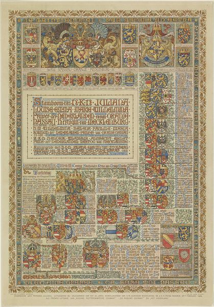 This anonymous commemorative print of the Dutch provinces and capitals, likely made using lithography, is a real kaleidoscope of heraldic imagery. The whole thing is steeped in tradition. What strikes me is the level of detail, repeated across each emblem. There’s a sort of delicate precision to the line work, yet there's a looseness to the application of colour that keeps it all from feeling too stiff. Look at the contrast between the symmetry and controlled composition of the central crest versus the tiny variations within the bordering floral ornamentation. This kind of contrast highlights art making as a kind of balancing act. It reminds me a bit of some of those densely packed, symbolic works by Hilma af Klint, though more formal, of course. Both share this sense of wanting to communicate a wealth of information – almost too much to take in at once – and, like all good art, embracing the fact that there will always be some degree of ambiguity at play.