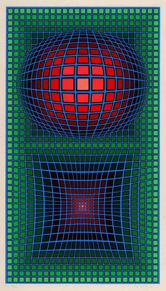 Victor Vasarely made this picture, Vega-Zett 02, using paint to create this optical illusion. It's fascinating how such flat color creates the impression of roundness, like a bubble emerging from the picture plane. The piece pulses with a sense of movement, due to the careful arrangement of red, blue and black, creating an effect that feels strangely mechanical. Look at how each colored disc is placed in such a precise way. This suggests an interest in art as a kind of system or structure. It reminds me a little of Bridget Riley's work, but without the same sense of fluidity. Vasarely's hard-edged forms are more definite, and the optical illusion more pronounced. Ultimately, the image opens up a space where vision and perception get delightfully tangled.