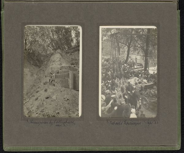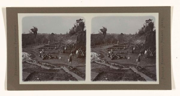 This is a stereograph titled "Tinmijn te Soengeiliat" by Robert Julius Boers, part of the Rijksmuseum collection. The sepia tones imbue the scene with a stark, documentary feel. The composition is bisected, presenting a comparative view of the tin mine. Note how the symmetrical arrangement draws our eye across the landscape, from the figures to the textured earth and rudimentary mining structures. Boers uses the stereograph format, popular in the late 19th century, to enhance the sense of depth and realism. But this choice also invites a critical reading. Does the doubled image simply offer a fuller picture, or does it subtly highlight the repetitive, relentless nature of colonial extraction? The formal structure of the stereograph then serves to underscore the socio-political realities of the mining operation. Consider how the formal properties of photography here engage with broader themes of labor, colonialism, and representation. The image prompts us to reflect on the ways in which visual media can both reveal and conceal aspects of our shared history.