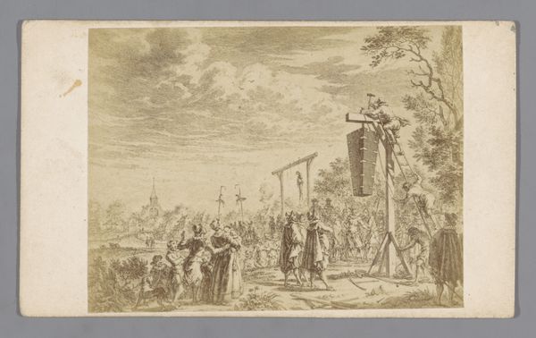 Editor: This is a 19th-century engraving, "Certificate of Bible Society," by Asher Brown Durand. It's packed with figures and a huge printing press at the center, and at first glance it feels… well, staged. Like a really intense historical reenactment. What stands out to you most in this work? Curator: "Staged" is an interesting observation; I can almost see Durand as a theatre director, arranging his players on that little hill. See how the light almost aggressively spotlights the printing press – the very engine of the Bible Society! It reminds me of a stage set. Look at the variety of faces in the crowd—do you recognize types you've seen represented elsewhere in Academic or Romantic art? Durand’s academic grounding shines through in that calculated blend of realism and idealism. Editor: Definitely. And the folks on the margins seem to be a cross section of society. What is Durand trying to say? Curator: He's making a statement about the Bible Society's influence, literally broadcasting its message. It's more than documentation. Those emanating rays of light—a bit heavy-handed, maybe? But also, it transforms the mundane printing press into something divinely ordained, literally a machine blessed by God. The crowd, that wonderfully rendered crowd… is not there *merely* to read; they're there to *witness*. They complete the symbol! I wonder, were such certificates common? What did it *mean* to be granted such document in this period? Editor: A blessed machine…that makes so much sense now that you point it out. So, is this, in your view, a glorification of technology meeting faith? Curator: Precisely. Durand seems to be celebrating that very intersection! To be critical, though, I’d observe that the image has lost that immediacy that strikes in Genre paintings such as Daumier’s lithographies; this, perhaps, because of the overt glorification of his object. But also, it suggests anxieties of mass production, doesn’t it? Making faith *available*, replicable. I do wonder what Durand would have to say about digital dissemination! Editor: True, I hadn’t considered that angle. I am off to research genre paintings now, and perhaps this opens the door for new perspectives on 19th-century engravings. Thanks so much. Curator: The pleasure was entirely mine, my dear. Now *I* have something to think about: the intersection of faith and *anxiety*. How marvelous that art makes our intellectual path glow!
