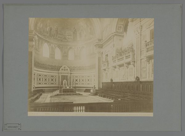 This photograph of the interior of La Madeleine in Paris was made by an anonymous photographer, using the 19th-century technique of albumen print. This process involved coating paper with albumen, found in egg whites, and then using it as a surface for light-sensitive silver salts. The resulting sepia-toned image has a distinctive, soft quality, and a wide tonal range. The final print is mounted onto card stock. The albumen process itself has social significance. Photography was a booming industry at the time, and studios would have employed many workers to prepare the prints, which would then have been sold as souvenirs to tourists. This points to the democratization of image-making at the time, and the rise of a consumer culture that created a demand for mass-produced images. The amount of work involved in the production process, from preparing the albumen paper to mounting the final print, speaks to the labor and skill required to produce these images. The photograph presents a snapshot of a particular moment in time, and also provides a window into the social and economic forces that shaped the production and consumption of images in the 19th century.