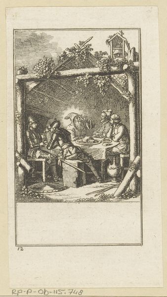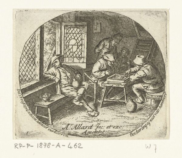 Curator: Here we have Adriaen van Ostade's "Tric Trac Players," likely created sometime between 1610 and 1685. It’s an engraving, a print, offering us a small slice of 17th-century Dutch life. What strikes you about it? Editor: There’s a wonderful intimacy. It feels like sneaking a peek into a private world. The light and shadow create such a warm, almost hushed atmosphere, like the clatter of the game is softened by the haze of a sleepy afternoon. Curator: Indeed, Ostade excels at capturing everyday scenes. He’s often celebrated for his realism, showing us life as it was. Genre paintings like this were increasingly popular during the Dutch Golden Age, catering to a burgeoning middle class interested in depictions of their own lives. Editor: You can almost hear the quiet concentration and the casual camaraderie. What’s so captivating is the range of emotions within this contained space – from the introspective solitude of the figure by the window, gazing out as though pondering life's mysteries, to the intense focus of the tric-trac players. There is so much storytelling here, it bursts from such simple means. Curator: It is striking how the architecture frames the action, making us as viewers feel somehow both included and excluded at the same time. Think, too, about what’s missing, or perhaps intentionally excluded. Notice how there's no indication of the larger political and economic forces at play. These works functioned as a kind of social record, but they are partial views, very selective, emphasizing instead the intimacy of domesticity and leisure. Editor: Ostade has truly bottled something essential, a reminder that human connections are often woven in these humble, ordinary moments, seemingly inconsequential yet deeply, beautifully human. Curator: Precisely. It is important to look beyond the charm and recognize that this seemingly innocuous scene participated in a much wider trend of image production at the time. It spoke to ideas about labor and leisure that helped define an emerging national identity in the Dutch Republic. Editor: It is a bit sad knowing how many layers are lost over time as the scene remains captivating nevertheless.