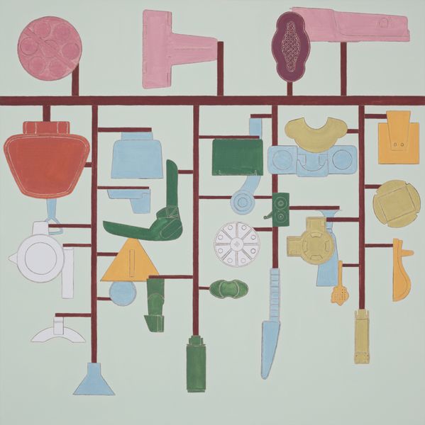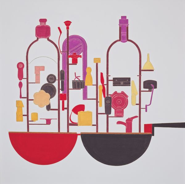 Alfio Giuffrida made ‘Hängende Pflanzen Exp2’ with paint, and it's this world of hanging plants but they’re not quite plants, are they? The red lines create a kind of structure, a grid that feels almost like a blueprint or a building under construction. Each shape has its own flat color, and the whole thing feels very considered, very built. There’s a playful flatness here, where nothing overlaps in a conventional way, but each element asserts its place in the composition. Take that green oval up top, with the white lines inside. It’s so simple, yet it has this quiet confidence. It reminds me of early modernist still life, or maybe even folk art, where the aim isn't to trick the eye, but to offer a clear, almost diagrammatic representation. It makes me think of someone like Stuart Davis, who also loved to distill everyday objects into bold, graphic forms. Art isn't just about copying reality, it’s about having a conversation with it, interpreting it, and then throwing it back at the world.