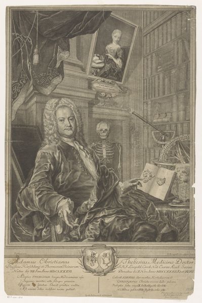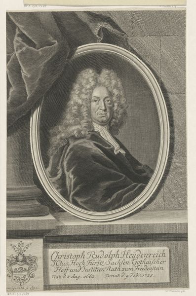 Curator: This is a portrait of Nicolas Coustou, rendered in 1730 in an engraving by Charles Dupuis. Coustou was a sculptor attached to the French Royal Academy. Editor: What strikes me first is the stillness, despite the subject appearing to be in the middle of creating. It’s all so meticulous—the curl of the wig, the folds in the satin, the delicate use of hatching to define the marble. There's an intimacy in this scene; I feel as if I am intruding on his creative process, as if stepping into his studio. Curator: Yes, and Dupuis uses the portrait to showcase Coustou’s standing as a sculptor and his association with the Academy. He is shown with a hammer, adding details to a bust. We also notice architectural details in the background which reinforce this visual association. This is no candid shot, but an artist's well crafted statement. Editor: Right, and what I find captivating is that this piece is about creation as much as it is about portrayal. The light catches the planes of both Coustou’s face and the sculpture. You feel a certain weight and texture from the material—Dupuis managed to trick my eye, almost! It calls into question what exactly defines sculpture—it really captures the dynamism and vitality inherent in baroque aesthetics, and the interplay between model, sculptor and artwork. Curator: I would say the technique has more to do with history painting and academic art! Think about how portraiture and engraving circulated these official images and perpetuated ideals in eighteenth century France. Look at the clear depiction, the details within the face, the gaze… it does indeed come across more as official. The visual elements speak to larger cultural narratives surrounding talent, status and creative enterprise. Editor: You’re right. Considering the formal pose and the details of his status rendered beneath the image—his place of birth, his roles with the Royal Academy… So the engraving itself performs an administrative function. I must remember that. Curator: We always do. Editor: Fair enough. It’s hard not to marvel at how art allows us to keep perceiving historical narratives that may be long gone—almost like exhuming echoes from our past.