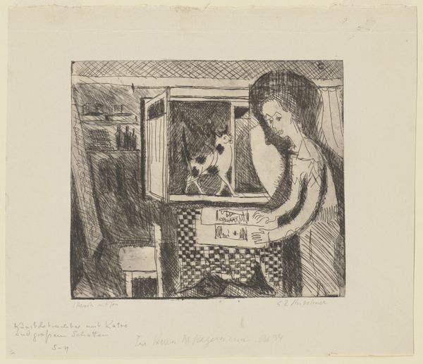 Editor: This is "Da bankede det på Døren, og der kom en fattig, gammel Mand..." or "Then there was a knock on the door, and there came a poor, old man..." created by Fritz Syberg between 1901 and 1902, a pencil drawing held at the SMK in Copenhagen. I notice how Syberg confines the scene in what appears to be a square grid, lending a certain structure to an otherwise intimate portrayal. How does this compositional choice inform your interpretation? Curator: The imposed grid is quite interesting. It creates a deliberate tension between the supposed spontaneity of a sketch and the structured constraint of a geometric framework. Do you see how the lines dissect the scene, almost compartmentalizing the figures within the interior? This emphasizes the planar nature of the work, pushing it towards a modernist understanding of space rather than illusionistic depth. It highlights the materiality of the drawing itself. Editor: Yes, I see what you mean! It’s not just a window into a scene; the grid makes me conscious of the drawing as an object. Is that grid also informing your view of what is in this picture? Curator: Indeed. It is relevant to also consider the starkness of the rendering in pencil. There are tonal values, and while some are definite lines, the soft gradients around the mother and child invite speculation on their emotional state within these constructed confines. The artist uses formal visual devices to give greater substance to our interpretation of how Syberg uses symbolism, no? Editor: That’s a good point. I hadn’t really considered the grid as a symbolic element as much as a technical one. It makes me think more about the constraints, maybe the confines of domestic life. Curator: Precisely! And within those self-imposed restrictions, Syberg manages to evoke intimacy, wouldn’t you agree? The work thus operates on multiple levels – structural, material, and thematic. The grid is more than just a compositional tool; it's a critical element of its meaning-making potential. Editor: I learned a lot by understanding how formal elements like the grid aren't just about structure but contribute to a piece's broader symbolic meaning. Curator: And that's the key – decoding how form informs content, thereby offering novel perspectives on an artwork!