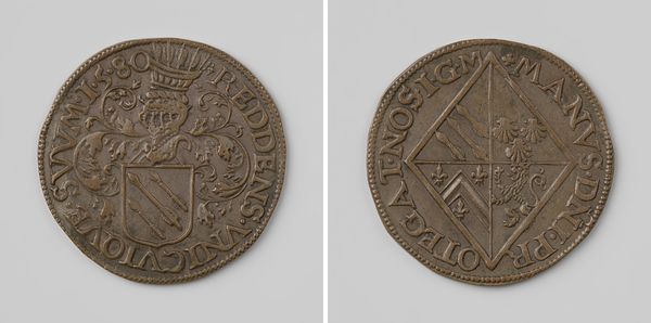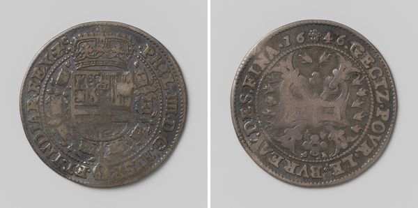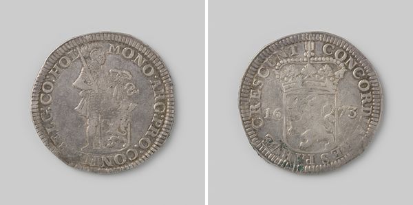 Editor: Here we have a Dutch silver coin, a "Hollandse scheepjesschelling" from 1670. One side features what looks like a crowned lion, the other a sailing ship. The coin’s surface looks rather worn which somehow makes it quite beautiful to my eye. What draws your attention when you look at it? Curator: Immediately, the bilateral symmetry is of primary interest. Note how both sides present a circular composition defined by the rim, but contrasting visual weight. One side presents heraldic imagery anchored by a strong central motif while the other incorporates a naturalistic scene dynamically integrated with text. Editor: Could you elaborate on the contrast? I see them both as quite striking designs, although I agree the crowned lion is very bold. Curator: Observe how the heraldic lion and crown establish verticality against a textured field; in contrast, the ship employs an elliptical movement suggesting forward motion on water. Furthermore, examine the treatment of line. On the lion side, lines define hard edges creating static forms whereas the ship utilizes a network of fine lines to convey volume, depth and atmosphere. Editor: That’s a fascinating breakdown. So you're saying the ship uses a more sophisticated, shall we say, painterly technique even though it’s a coin? Curator: Precisely! It prompts a meditation on function. Is the artistry subordinated to symbolic intent? Does its tactile presence elevate currency beyond simple exchange? What paradox is established by the artistry versus utilitarian function? Editor: This coin now seems less like simple money and more like a carefully considered statement. It makes me appreciate even mundane objects that might embody deeper artistry. Thank you. Curator: A rigorous analysis of formal structures can always enrich one’s appreciation for commonplace objects.