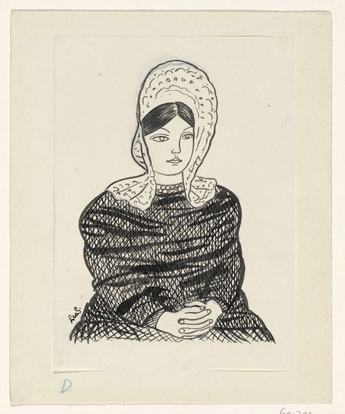 Editor: This is Bror Utter's "Lady With Box," created around 1940 using graphite for a print. It has a slightly unsettling feel to me, like a dream. What do you see in this piece, considered purely from a formal point of view? Curator: Initially, I observe the stark contrasts of light and shadow. Utter masterfully manipulates the graphite medium to create a visual tension between the foregrounded figure and the claustrophobic interior. The sharp angles of the room juxtapose with the woman’s rounded form, highlighting the interplay of geometric and organic shapes. Do you notice the deliberate distortion of proportion in her figure? Editor: Yes, her neck is elongated, and her shoulders seem exaggerated by the puffed sleeves. It almost feels sculptural, but flattened onto a 2D plane. What is the purpose of this surreal deformation? Curator: Indeed. The exaggeration pushes towards surrealism and creates a feeling of unease and alienation. By breaking down naturalistic form, the artist directs attention to the formal components themselves—the line, the texture, and the tonal variations across the surface. Observe how the grainy texture, achieved through graphite, adds to the mysteriousness of the subject and space. Editor: It is true; I now see the power of each of those lines contributing to a certain anxiety in the portrait, as well as pushing away from more standard representational approaches. I guess I came in looking for thematic meaning, but I see that so much meaning resides in the methods themselves. Curator: Precisely! The emotional impact is intrinsically linked to Utter's calculated manipulations of form and material. Form dictates function here! Editor: I see that the elements work in unison. Thank you! I will carry on examining form over content, because I feel this may shift how I look at artworks.
