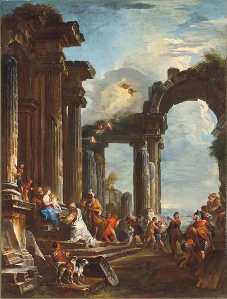 Curator: This painting, titled "Römische Ruinen, links ein Brunnen, mit Staffage," which translates to Roman Ruins, with a fountain on the left and figures, was created in 1789 by Jean François Gout. It resides here at the Städel Museum. Editor: My initial response is one of serene contemplation, a scene steeped in graceful melancholy. The delicate light and soft palette create an almost dreamlike state, despite the rather concrete subject matter of architecture. Curator: Indeed. The artist's embrace of classicism manifests in the measured arrangement of the architectural ruins. Note the columns, arches, and deliberate placement of the fountain. They all seem to speak to an age of reason and order. How do you interpret the ruinous aspect of the buildings? Editor: The ruins underscore a romantic engagement with time and history, quite common for the era. These remnants serve as visible symbols of mortality and the ephemeral nature of human endeavors. They romanticize decline. But I see a statement too about how such historic spaces become a new 'stage' of civic and public life through these staffage figures in the foreground. Curator: A potent interpretation. It's hard to not analyze the composition. It is certainly an idealized depiction, presenting a carefully constructed vision rather than an accurate historical record. It's meticulously painted, note the careful gradients in tone, and the delicate work in creating a believable perspective. Editor: Looking closer at the people populating the work is really interesting. They feel almost like they're from a completely different era or story as compared to the ruins. The scene has them as the main actors in how such ancient places might endure through daily life and culture. Curator: So, do we see Gout idealizing the endurance of cultural life against a grand scale of changing human and architectural time? Editor: Yes, these ruins also become locations of a cultural past constantly living on into the future. It all combines for me, through these gentle shades and deliberate formal gestures, to evoke contemplation around permanence. Curator: Yes, that reading harmonizes well with my understanding of Gout’s structural approach, giving his paintings such formal poise. Thank you for this discussion! Editor: The pleasure was mine. This piece offers so much on socio-political interpretations, how ancient art shapes civic experiences.