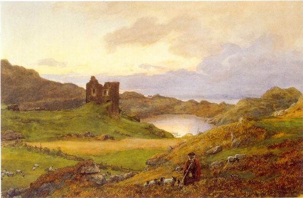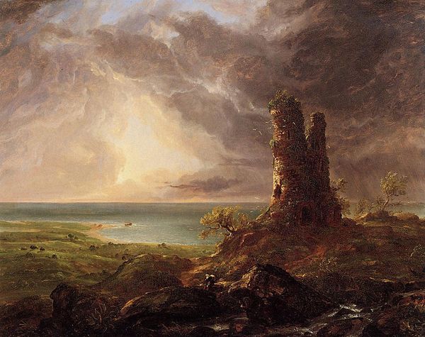 Editor: Here we have John Constable's "Hadleigh Castle, The Mouth of the Thames—Morning after a Stormy Night," painted in 1829, using oil paint. I'm struck by the sheer dynamism in this landscape – it feels so dramatic, with the ruins framed against that turbulent sky. What do you see in this piece? Curator: Well, first, observe how Constable meticulously structures the composition using contrasting diagonals. The upward thrust of the castle ruins opposes the receding horizontal expanse of the Thames estuary. Notice, also, the sophisticated employment of light and shadow. Do you perceive how Constable renders depth and form through the subtle gradations of tonal values? Editor: I do! The way the light catches the edges of the ruin, it creates a sense of almost tactile reality. It’s beautiful, but I find it very mournful. Curator: Precisely. Now consider how Constable’s brushstrokes contribute to this sense of transience and decay. See how the paint is applied thickly, impasto-like, in some areas, particularly within the architecture itself? This builds the illusion of crumbling texture. The interplay of the impasto of the architecture contrasting with the glazed surfaces elsewhere, what impact does that choice have on you? Editor: I'd say the sharp contrast brings more attention to the ruins of the castle in the foreground, making the backdrop seem far away. I love the clouds. It gives the ruins almost a haunted feel. Curator: Precisely. Do not lose sight of the overarching structure. The strategic positioning of these forms – light and shade, hard and soft brushstrokes – guides the eye and generates a feeling of depth, yet the essence lies in its two-dimensional design. Editor: This piece really highlights the expressive power within form and color itself. The landscape doesn't need to tell a literal story to evoke feeling. Curator: Exactly! Focusing on the intrinsic elements allowed us to peel away extraneous narratives and truly experience the art.