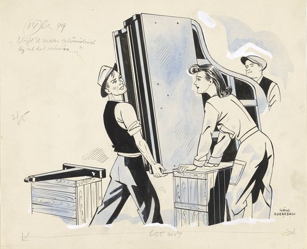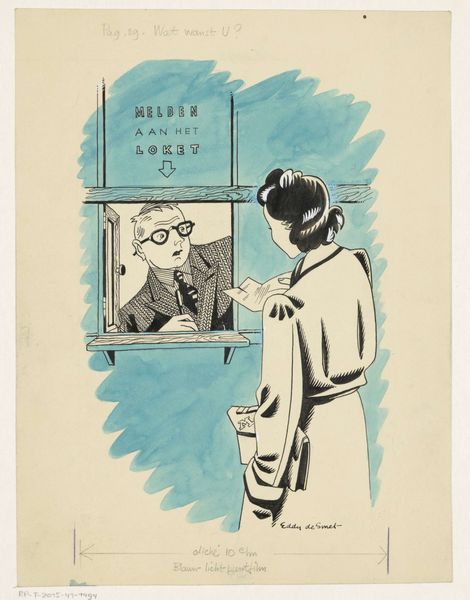 Eddy de Smet created this ink and watercolor drawing entitled "Marjo bij een loket met gebak" or "Marjo at a counter with pastries". The drawing depicts a young woman, Marjo, standing at an automated pastry vending machine, while a man looks on from behind her. Here we see the influence of both the commercial and the personal, intertwined in the context of post-war European society. The vending machine, a symbol of modernity and convenience, contrasts with Marjo's traditional headscarf and modest attire. The drawing speaks to the experience of women at this time who are navigating the tensions between tradition and modernity. How were they embracing new opportunities while still adhering to cultural expectations? The act of purchasing a pastry, a small, everyday pleasure, becomes charged with meaning as it reflects broader societal shifts and individual desires. This scene reminds us that even the most mundane moments are shaped by the complex interplay of history, identity, and culture.