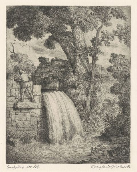 Editor: We're looking at "Waterval," created in 1872 by Jan Gerard Smits. It's a landscape rendered in ink and etching. The textures! There's something so calming, yet incredibly detailed, about this waterfall scene. What catches your eye most in this piece? Curator: You know, it's funny, it’s the way the artist uses such intricate detail to convey this powerful, raw natural force. It feels almost… meditative. But when I look closer, beyond the serenity, I sense a kind of vulnerability. Smits seems to capture nature's quiet strength. The textures aren't just descriptive; they’re almost… emotional. What do you make of the single bird perched up at the top? Editor: That bird, sitting there, makes the rest of the scene come alive. Do you think it might symbolize freedom, like nature’s liberty to continue in a world impacted by urbanization? Curator: It could be, and maybe more. Perhaps it’s an embodiment of the observer, a stand-in for Smits himself, perched on the edge of wildness. It reminds me, too, of those old landscape paintings where a tiny human figure emphasized the vastness of nature and our small place in it. Editor: That’s a great point. I didn't initially consider the figure in older paintings like this and their link. Thanks, I feel like I have a new appreciation of landscape art. Curator: And I suppose I have a fresh take too now - it's important to feel small sometimes!