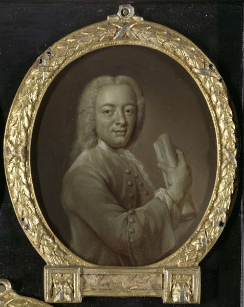 Curator: Let's examine this oval portrait by Jan Maurits Quinkhard. It is a depiction in oil paint of Bernardus de Bosch I, an 18th-century poet and art patron from Amsterdam. Quinkhard produced it sometime between 1732 and 1771. Editor: There’s a striking modesty to the colour palette. Restrained tones give it a certain intimacy despite its slightly grand Baroque flair, no? Curator: Indeed. The artist's choice of oil paint and his manipulation of light allow him to demonstrate texture—the softness of the sitter’s hair and the precise detailing in the costume, all indicating a patron who valued quality craftsmanship and likely invested considerably in supporting such labor. Editor: Note also the direction of his gaze and that slight, almost secretive smile playing at the corners of his lips. Those elements draw us into the man’s inner world, his psychological space rendered beautifully through line and tone. The holding of the papers creates a point to draw your eye in! Curator: We see not just a face, but an individual whose patronage had tangible benefits for Quinkhard, shaping his artistic trajectory. Consider, too, the commodification of artistry embedded within the patronage system itself; these transactions underpinned much of the Baroque aesthetic. Editor: I appreciate how Quinkhard frames De Bosch within this oval. The artist emphasizes certain virtues—intellect, perhaps, and a sensitivity reflected in those softened edges. Compositionally, it directs our focus to those qualities. Curator: These commissions helped support workshops and craftspeople, affecting what materials were accessible and affordable, dictating art production as a business. It is no doubt this transaction, along with similar portraits commissioned by other wealthy merchants, contributed to a particular fashion and economy around artistic likeness. Editor: Perhaps a beautiful illustration of status then - but undeniably well structured. I will remember those aesthetic and tonal choices long after this visit! Curator: Precisely. We can read how wealth and artistic expression intersected to make it to the wall. It's really fascinating to ponder this in today's art market too.