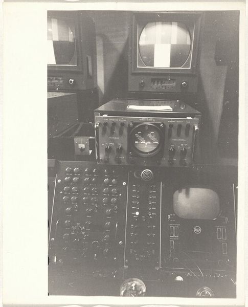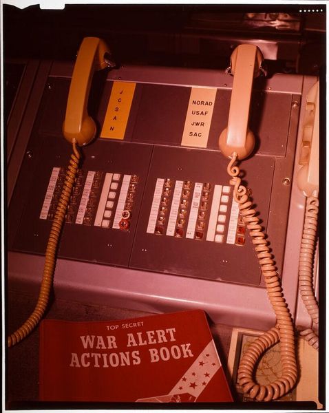 Curator: This intriguing photograph by Jack Gould, simply titled "Untitled (government telephones with many buttons)," presents us with a tableau of mid-century communication technology. The image itself is small, only 6x6 cm. Editor: What strikes me immediately is how cold it feels. The pale colors, the repetitive buttons, the dangling cords... it evokes a sense of sterile efficiency, like a machine waiting for a command. Curator: Absolutely. The materiality of these objects – the molded plastic of the telephones, the metal console – speaks to a specific era and a utilitarian design language. The presence of acronyms like NORAD and USAF underscore the military-industrial complex that defined much of 20th-century production. Editor: And those acronyms are powerful symbols! NORAD, in particular, conjures up images of Cold War anxieties, of constant vigilance. These aren't just phones; they are conduits to a world on the brink. They’re like relics of a very specific psychological landscape. Curator: Exactly. By focusing on these often-overlooked technologies, Gould draws attention to the material conditions that underpin those anxieties. The labor and resources poured into these systems. Editor: It makes you wonder about the unseen people on the other end of those lines, the weight of their decisions. Perhaps Gould is reminding us of the human element lost within these imposing structures. Curator: Indeed, a potent reminder of the tangible infrastructure shaping our intangible fears. Editor: A chilling photograph, made all the more so by its quiet, unassuming presentation.
