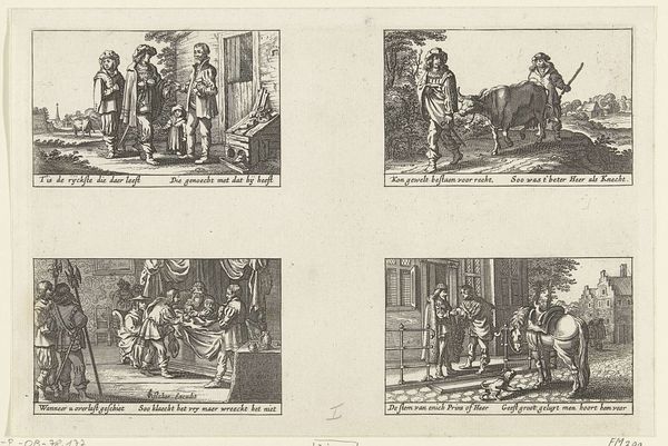 This series of engravings, created by Claes Jansz Visscher, depicts the story of the Prodigal Son. Notice how the narrative unfolds through distinct scenes, a visual structure reminiscent of medieval morality plays. Central is the motif of the 'return,' deeply rooted in religious and humanistic traditions. The son's journey—departure, dissipation, and eventual return—mirrors a timeless cycle of sin, repentance, and forgiveness. This motif appears across cultures, echoing in classical myths and Renaissance dramas. The act of kneeling, seen in the final scene, signifies humility and supplication. This gesture, repeated throughout history in religious and secular contexts, reflects a universal desire for redemption. The emotional weight of the image lies in its ability to tap into our collective memory. It represents a non-linear, cyclical progression of sin and redemption, resonating with the viewer and engaging on a deep, subconscious level.
