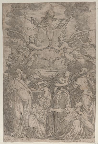 This engraving of the Holy Trinity, with the dead Christ at the center, was made by an anonymous artist. The image depicts God the Father and the Holy Spirit watching over the dead Christ, surrounded by angels, suggesting the power and glory of the Christian faith. In a time when religious institutions held immense sway, such images reinforced their spiritual authority. They acted as visual tools, communicating complex theological ideas to a largely illiterate public. The cultural references in this image – angels, the Trinity, Christ’s sacrifice – are deeply rooted in the religious traditions of its time. The artist's choice to remain anonymous also raises questions about the role of the individual artist within religious institutions. Was this a deliberate act of humility, or did it reflect the artist's position within a hierarchical system? Understanding such an image requires us to consider the religious, social, and institutional contexts in which it was made and circulated. By examining historical sources and religious texts, we can uncover the meanings it held for its original viewers.