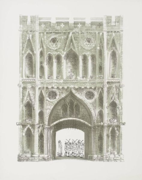 Curator: Valerie Thornton's "Sangüesa" presents us with a fascinating study in architectural detail. The image dimensions are 648 by 416 mm, and it resides in the Tate Collections. Editor: The print has a monumental presence. I'm immediately struck by the density of the carved details and the weight of the stone. Curator: Absolutely. Thornton's technique really emphasizes the physical act of creation. Look at how the lines build up to describe the facade. It invites us to consider the labor of the artisans who originally crafted the building, and Thornton’s labor in reproducing it. Editor: Indeed, and the print invites us to consider the role of religious architecture, particularly Romanesque cathedrals, in shaping cultural values and the control of information. Curator: It's remarkable how she uses a limited palette to convey the texture and age of the building’s materials. Editor: Yes, and how Thornton transforms this cathedral façade into a commentary on power, belief, and the institutions that perpetuate them. Curator: A really thought-provoking intersection of architectural history and material practice. Editor: I agree. Thornton pushes us to see the politics embedded within stone and ink.