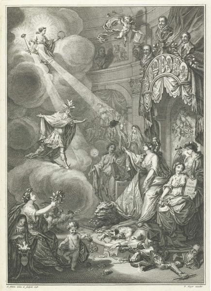Curator: What strikes you first about this image, “Saul at the Witch of Endor,” an engraving from 1766 by Simon Fokke? Editor: The sheer drama! The light and shadow, the figures contorted in fear... it feels like a stage set for a nightmare. The ghostly apparition rising from the smoke is especially unnerving. Curator: Indeed. Fokke expertly uses the line technique of engraving to build incredible tension, doesn't he? It's an illustration of a specific moment, drawn from the Books of Samuel. We are witnessing Saul, the King of Israel, consulting a witch in disguise. Samuel, the prophet, had died, and the biblical narrative frames it as Saul secretly sought a medium to summon Samuel’s spirit to ask advice about an impending battle with the Philistines. Editor: The summoning of the dead... always a potent symbol. What strikes me is how universally it resonates. The anxiety about the future, the desire to know what's coming – that’s embedded deep in human culture. The figure of Saul almost pleading in the lower corner really captures a primal desire. Curator: This work speaks volumes about the visual culture of its time as well. The narrative art of the Baroque, of which this engraving exhibits several traits, sought to illustrate religious and historical tales, to make moral points within contemporary sociopolitical dynamics. Consider the composition – everything pulls our eye toward the central apparition, highlighting the gravity of defying divine law for short term security. Editor: And the shadowy figures in the tent behind the witch – are those demons, or simply the product of Saul's terrified imagination? Either way, the image conveys a real sense of transgression, of boundaries being crossed. Curator: These iconographic representations became increasingly complex and stylized, and the interpretation would surely have evolved, yet images like this helped maintain the religious and political frameworks that characterized the Netherlands. Editor: Knowing the context makes it all the more powerful. Fokke captured more than just a biblical scene, the symbolic anxieties regarding political stability. I'm leaving this piece contemplating the delicate line between power, desperation, and the enduring allure of the forbidden. Curator: For me, seeing it reveals a compelling glimpse into the religious storytelling and imagery that pervaded society at that moment in the 18th century.