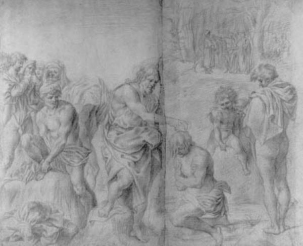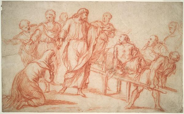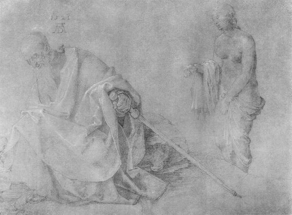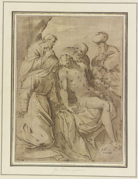Editor: This is Willem Panneels' "Pythagoras of Samos(?)," created between 1628 and 1630. It's a drawing, using pencil, currently held at the SMK in Copenhagen. The figures seem to be emerging from the background; it's so dynamic. What stands out to you most about this sketch? Curator: The dynamism you notice speaks volumes. Panneels seems to capture not just likeness but the very *idea* of Pythagoras. Notice the drapery – it swirls and flows, almost alive. What does that choice of depiction convey to you? How does the looseness and sketch-like feel relate to the image itself? Editor: I see... it's not just a static portrait. The fluidity gives it a sense of ongoing thought and discovery. The way the lines aren't fully defined also makes it feel like a work in progress – perfect for representing a philosopher constantly seeking knowledge. What do you think of that open interpretation? Curator: Precisely. And consider the slight vagueness around his identity: "Pythagoras of Samos(?)." This signals the Renaissance fascination with classical figures, often pieced together from fragmented accounts. Do you get a sense of Panneels using Pythagoras' established persona, such as that of a teacher and numerologist, in any recognizable forms, either direct or metaphorical? Editor: Hmm, not directly... I am trying to view this using everything that has been discussed, and even what has not been overtly explored. It certainly has offered some new viewpoints on what otherwise would be a simple character study of a historical figure! Curator: And therein lies its power! It encapsulates the Renaissance's re-engagement with classical thought and hints to the endless pursuit of knowledge through inquiry and representation.