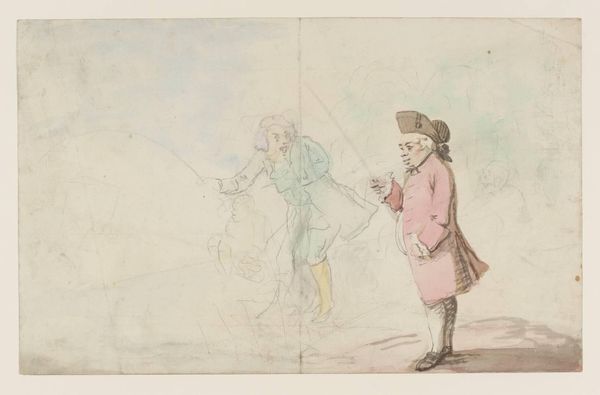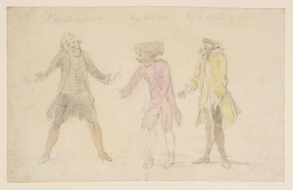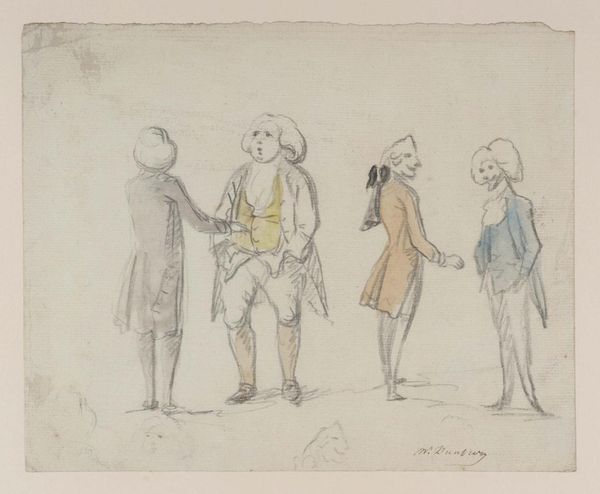 Curator: This is "The Scandalmongers, I" by Henry William Bunbury, part of the Tate Collections. Editor: Oh, it feels like a fleeting moment caught in whispers! The hasty lines, the pale washes—it's all so delightfully ephemeral. Curator: Bunbury, who lived from 1750 to 1811, was a master of social satire. This drawing likely reflects the Georgian era's obsession with gossip and reputation. Editor: The way they're positioned, each reacting in their own exaggerated way, it’s as if the rumor itself is passing from one to the next, gaining momentum and color! Curator: Note the use of watercolor washes over the pencil sketch, a relatively inexpensive and quick medium that allowed for mass production of prints based on his drawings. Editor: It makes you wonder what scandalous morsel they're trading. I can almost hear their voices, raised in mock horror and sly delight. Curator: Indeed. Bunbury captured not just the look, but the performance of scandal. Editor: It's a playful piece, reminding us that some things, like the love of a good rumor, never truly change. Curator: A fitting observation that highlights the social context and enduring nature of such human behaviour.