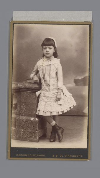 This is a cabinet card photograph of an unknown girl by L.B.J. Serré from Amersfoort. Notice the column with the coat-of-arms relief, a motif that echoes classical portraiture, lending the subject a sense of dignity and timelessness. The column, often seen in depictions of nobility, serves as a symbolic anchor, rooting the sitter in a tradition of power and prestige. But consider how this symbol evolves. From ancient Roman sculptures to Renaissance paintings, columns have been repurposed across epochs. Each time, they gather new layers of meaning, reflecting changing societal values, yet retaining a whisper of their original grandeur. What does it mean to see this symbol used here, in a photograph? It creates an interplay between the timeless and the modern, engaging our subconscious recognition of established status symbols. Observe the quiet composure of the child, a powerful force engaging viewers on a deep, subconscious level. In this way, symbols resurface, evolve, and take on new meanings in different historical contexts.