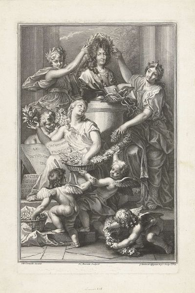 Curator:So, here we have Giulio Bonasone's engraving, "Vulcan, Neptune, Athena, and other Gods making Shackles to pull Jupiter from the Heavens, set within an elaborate frame, from "Loves, Rages and Jealousies of Juno"," dating back to the mid-16th century. The scene is chaotic! What jumps out at you? Editor: The sheer busyness of it! All those figures crammed into a relatively small space, each one engaged in a very physical activity, set against this darkly etched background and ornamental frame. It’s… intense. Is there a particular story behind it? Curator: It’s a scene of divine rebellion, quite audacious for its time! Imagine these gods – Vulcan with his forge, Neptune, Athena – all conspiring to dethrone Jupiter, the king of the gods. Bonasone captures that feeling of brewing resentment and barely contained energy so well, don’t you think? The elaborate frame even seems to barely contain the scene. Does the ornamental aspect strike you as harmonious, or discordant? Editor: Discordant, definitely! I see the beauty in the frame itself – the swans and masks, those figures intertwined with fruit garlands are nice – but when juxtaposed against the grit of the forge, it almost feels satirical. What are your thoughts on the Mannerist style in the image? Curator: Mannerism loved to play with exaggeration and artifice, didn't it? You see that elongated figure of Athena, those dramatic poses, that sense of unease even amidst supposed beauty. It’s like a beautiful nightmare, and a reminder that even the gods aren't immune to jealousy and rage. Editor: So, it's not just a historical record or mythological illustration; it's really a commentary on human nature, filtered through the lens of the gods. Curator: Precisely. It shows how Renaissance artists were using classical stories to explore complex themes of power, ambition, and the darker side of human nature. Quite a feat for a simple engraving, no? Editor: It makes you think about the struggles within hierarchies, in a pretty lasting manner! I definitely view it in a different light now.