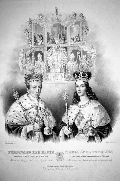 Editor: Right now we’re looking at “Konstantin and Irina,” which seems to be a historical portrait executed in oil paint. The subjects are decked out in royal regalia, all vibrant reds and golds, almost Byzantine in style, but something about their stiff poses and slightly mismatched expressions makes me feel a quirky tension. What leaps out at you when you look at this piece? Curator: Well, it’s interesting that you mention "quirky tension" - that's exactly where its magic lies, isn’t it? It reminds me of stepping into a dream where history blurs. Notice the patterned opulence of the robes, the solemn expressions juxtaposed with these rather childlike stances. It’s as if we’re peering through a time portal, a half-remembered fairytale. I see an attempt to capture royalty, yes, but filtered through a lens of naive wonder and genuine affection. What story do *you* think it whispers? Editor: That is beautifully put. A half-remembered fairytale! I guess I’m so used to flawless, hyper-realistic portraits that the lack of perfect symmetry threw me off, but you're right, that is the charm. I'm curious, are there any particular historical references in this work? Curator: Oh, undoubtedly! I think there's a clear attempt to harken back to Byzantine iconography, with the flattened perspective and the regal stiffness. Look at the deliberate patterning and colour palette reminiscent of mosaics and medieval manuscript illuminations. Perhaps the artist felt drawn to capturing a long and somewhat fantastical version of the past. Is it effective, do you think? Editor: Absolutely. The combination of that and the slight naiveté creates a very unique and engaging feel, like folk art with a royal subject. It really changes how I see portraiture, blending formal history with a touch of playful imagination. Curator: Indeed. It just goes to show that "imperfection," or rather, deviation from the expected, can be incredibly powerful. Art, at its heart, is storytelling, and this portrait speaks volumes by embracing a distinct creative voice. Editor: Thanks for sharing your insights. It’s fascinating to see how a modern eye can connect with art rooted in historical styles, yet transformed by individual expression.