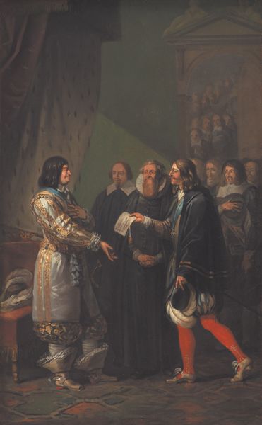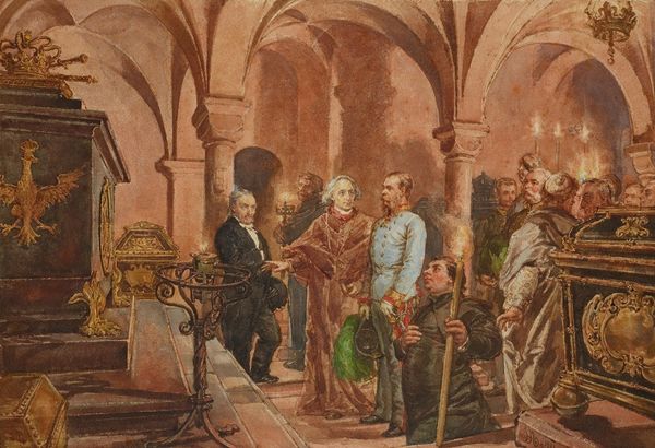 Jan Matejko painted this image of ‘Coronation of the first king A.D. 1001’ using oil on canvas, a process that entails layering pigments to create a scene steeped in both drama and history. Look closely, and you'll see how Matejko has used the very materiality of paint to evoke a sense of the past. Oil paint, with its capacity for rich color and deep shadow, allows Matejko to build up the scene, imbuing it with an almost tangible presence. The brushstrokes, though blended, hint at the labor involved in the painting's creation. Each layer of paint, each carefully chosen pigment, contributes to the overall effect of historical weightiness. Matejko was not just a painter but also a historian, deeply engaged with the cultural and political narratives of Poland. His choice of oil on canvas, a medium closely associated with academic painting, signals his ambition to create a lasting historical statement. In doing so, he elevates the act of painting beyond mere representation, imbuing it with the power to shape collective memory and national identity.