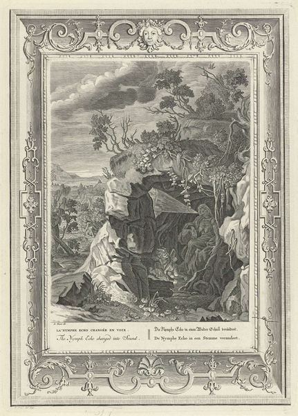 Bernard Picart created this print, "Pan en Syrinx," sometime between 1673 and 1733. Picart made engravings that often visualized stories from Greek and Roman mythology. Here, we see Pan, a figure known for his association with nature and rustic music, in pursuit of Syrinx. Syrinx, to escape Pan's advances, transforms herself into reeds. Picart's work reflects the cultural milieu of his time, where classical themes were reinterpreted through a contemporary lens. The story of Pan and Syrinx is laden with themes of desire and transformation, yet there is a darker side to this encounter, one of unwanted pursuit and the loss of agency. The tale evokes questions of power and consent, offering a space to reflect on the ways in which narratives of transformation can obscure issues of coercion. It prompts us to consider the tension between the aesthetic beauty of the artwork, and the complex issues it raises.