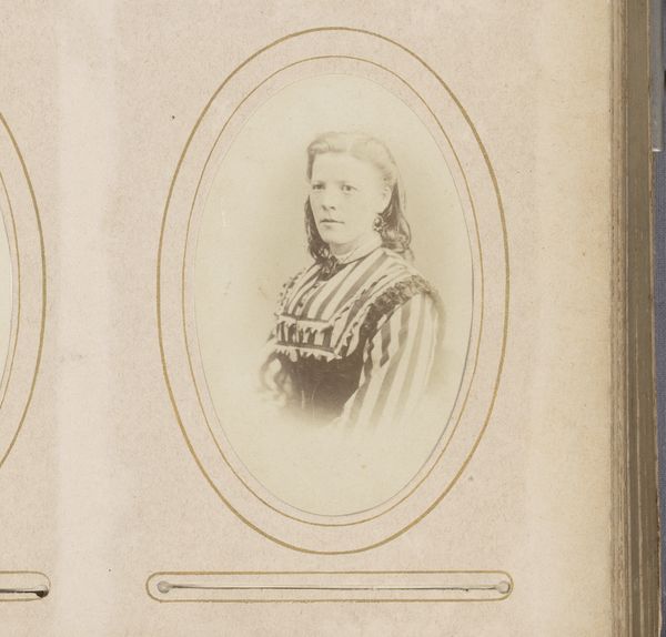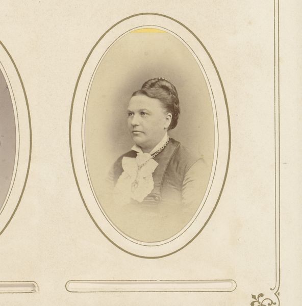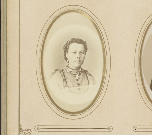 Curator: This is an albumen print titled "Portret van een vrouw", or "Portrait of a Woman," attributed to Johannes Petrus Oppers, dating from 1869 to 1890. It's currently held in the Rijksmuseum collection. Editor: My first thought is that there's such a stark contrast between the crispness of her face and the ethereal softness surrounding it. The framing almost turns it into an object of memory. Curator: Absolutely. And it's crucial to recognize that this form of portraiture wasn’t simply about capturing likeness; it was deeply intertwined with constructing identity and class in the 19th century. Think about the very deliberate pose, the clothing, the accessories...all signifiers within a strict social code. Editor: Precisely. The choice of the albumen print – the process involving coating paper with egg white – adds another layer of complexity. The very material speaks of domesticity, of skilled labor transforming a common substance into a means of preserving an image. You also must acknowledge the process that it involved given this was such a time-consuming, manually laborious approach in pre-mass media photography. Curator: And considering that photography was still quite novel at this time, it allowed for a democratization of portraiture that painting, for example, could not offer. What statements do you believe the photographer made from his decision on background and editing? Editor: I read the background as speaking to some kind of higher status aspiration in the time, with its design seeming much more decorative. I'm interested in what the choice to set the subject against that backdrop suggests about the photographer's own ambition and artistry, too. How much were they seeking to elevate their craft? Curator: I find it poignant that even through the softening effects, we're confronted with a face that, while presented within specific societal constraints, manages to retain a quiet, enduring presence. The female gaze and body were often subjected to control, and to analyze the impact and meaning that carries offers another layer of understanding. Editor: Looking at it with the understanding that a time consuming process was needed also tells you a great deal more of its material relevance and potential status of the people it captures and displays. Ultimately, these portraits were tangible expressions of status, memorializing the subject. Curator: This photo shows a face caught between societal expectations and her own, individual identity. Editor: Leaving me in awe over both its artistry and craft, and thinking through its deeper social implications of process and use.