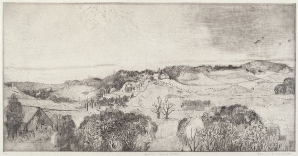 Curator: This is David Young Cameron's 1897 etching, "Ye Banks and Braes". Editor: It's immediately striking how tranquil it feels, even though it's all in monochrome. The composition guides your eye so gently across the water. Curator: Cameron was deeply involved in the Etching Revival, so he was very intentionally referencing older traditions while grappling with modern aesthetics. Editor: The dark areas against the lighter sky create a strong contrast. Those reeds in the foreground have a stark presence against the soft, mirrored reflections on the water. There is an attention to form but it appears unfinished to me. Curator: Yes, you’re touching on the piece's tension between traditional landscape and modern themes. Romanticism certainly played a part in these new interpretations of landscape which emerged around that time, where the lines become more blurry as to what one can call “traditional” Editor: What strikes me is the tiny figure in the boat. Almost dwarfed by nature, and rendered economically. The economy of the etching is quite nice and in certain ways, contrasts what some might find romantic or beautiful. Curator: It's intriguing how Cameron positions the viewer. It makes one think about labor and leisure within the changing landscapes of the late 19th century. Who gets to access these spaces? What are the forces shaping this apparent idyll? Editor: I was so drawn to the scene and its composition I never even stopped to wonder that for a moment! Thank you for helping me expand my interpretation. Curator: And thank you for providing a way into it using a completely different sense of seeing. This piece clearly offers different entry points for considering its historical moment.