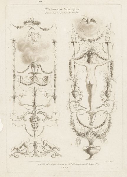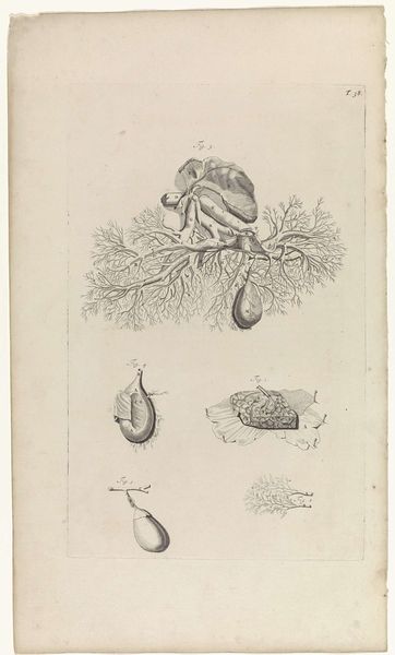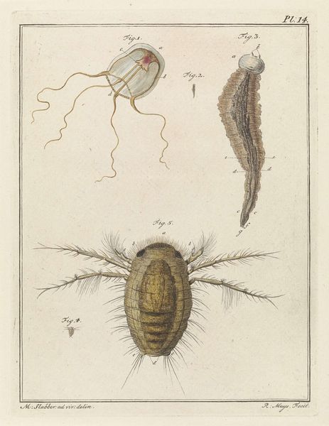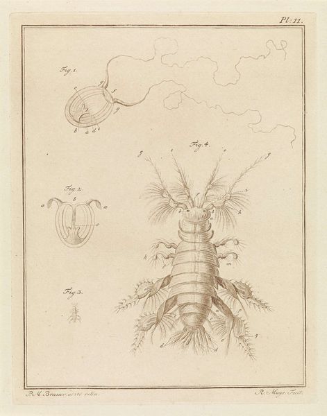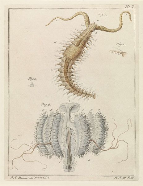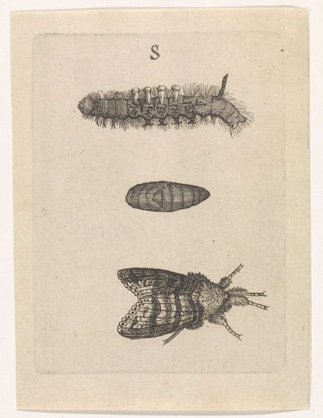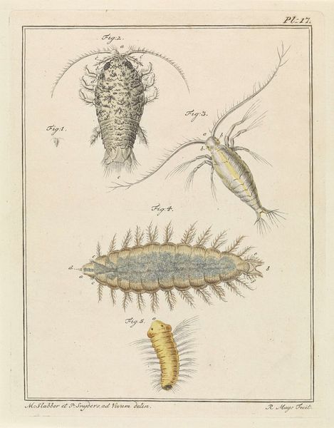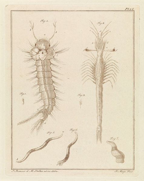 Curator: What an interesting tableau! Before us we have “Pluimmug larve” created around 1778 by Robbert Muys. This detailed image, currently housed in the Rijksmuseum, is a print employing etching, pen, and paper techniques. The depicted larvae, while perhaps unsettling to some, showcases Muys’ clear skill in both art and scientific illustration. Editor: Unsettling is right! It has this sort of clinical detachment... Makes me think of old textbooks and stuff under microscopes. Even though the image itself is beautiful, the stark presentation takes you far from any emotional investment you may have with, say, bugs! Curator: That dispassion likely stems from the conventions of the era, as realism was just starting to gain serious traction, and anatomical or zoological drawing served academic as well as aesthetic functions. Images of insects—even unattractive ones—served to broaden understandings and inform scholarship. What the viewer “felt” wasn't the driving priority. Editor: Hmm. It's cool how the academic precision emphasizes certain angles and textures... Like in Figure 3. The etching almost transforms something unsettling into pure line work... It gives this strange harmony to otherwise pretty horrifying images. Did Muys himself intend this drawing as pure academic illustration or do you feel that he saw his own “style” shine through this image? Curator: Well, by examining similar illustrations, and by knowing a bit of Robbert Muys' personal artistic ambitions, we can assume that these sketches fit quite well into broader trends of late 18th-century scientific illustration. In this sense, his “style” wasn't that important—that role was surrendered to scientific goals, although his technique and personal artistry did sneak through. Editor: Even through all the history and science, seeing these sorts of drawings now is almost like rediscovering a whole weird universe. It makes you think about how much the way we portray the natural world is always linked to how society “sees” it. Curator: Precisely. Thank you for sharing such a visceral insight—these larval forms remind us that even in meticulous scientific endeavor, humanity's footprint leaves a definite imprint.