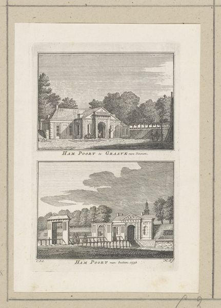 Hendrik Spilman created this print, "Gezichten op de Herenweg bij Haarlem", using etching. The artwork is structured into three distinct scenes, each presenting a view along the Herenweg, a road near Haarlem. The composition relies heavily on the use of line to define the architectural and natural elements. The lines are precise, creating a sense of order and clarity in the depiction of trees, buildings, and figures. The strategic placement of trees along the roadside acts as a framing device, guiding the viewer's eye into the depicted spaces. The limited tonal range, typical of etchings, emphasizes form and structure over color, encouraging a focus on the underlying geometric relationships within each view. The linear perspective employed in each scene reflects the period's interest in rational spatial organization. This print not only captures specific locations but also engages with broader cultural values related to order, perspective, and representation.