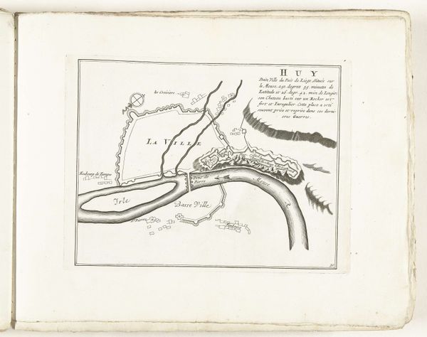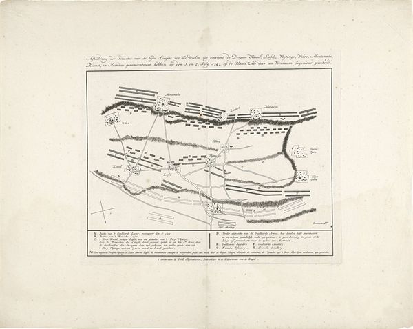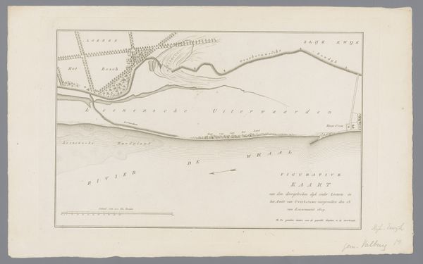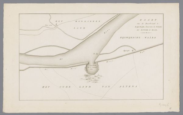 Curator: Looking at this work, “Kaart van dijkdoorbraak in de Bommelerwaard, 1809,” we see a depiction, rendered in ink on paper, mapping the levee breach in Bommelerwaard, created in 1809 by an anonymous artist. What is your initial take? Editor: A topographical drawing! It evokes the calm before the storm, so to speak. There's a strange peace to this ordered chaos. The precision highlights the disruption caused by something natural and unavoidable; a disaster laid bare as a quiet story on paper. Curator: Precisely. The calm presentation is quite characteristic for the period; it represents an attempt to document and understand the consequences of a natural disaster within the framework of the existing political and social structure. Notice the clear labeling, essential to Dutch administration, to give order to a region thrown into chaos. Editor: Yes, it's as if to say, “Even chaos can be measured, categorized, and therefore, controlled." But can we ever control water? It is rendered so gently here with simple, light ink. The blank space surrounding it almost swallows it up. Curator: Control was indeed the objective, certainly in the 19th century, in an effort to learn how to avoid the breaches in the future. The disaster becomes data. History is recorded in this objective rendering. The map gives insight into land usage, river flows, all the vital infrastructure destroyed, to give context and clarity for future mitigation and political awareness of flood impact. Editor: I like that idea, "Disaster as data”. Because viewed now, it’s as if the map holds a secret language, where the thin lines represent fragile, watery barriers between life and submersion, prosperity, and poverty. It’s haunting. Curator: Ultimately, works like this highlight a moment where nature confronted society head-on. They serve as powerful testaments to the enduring battle between human efforts and the sheer force of natural events. Editor: Right, and maybe an artist's reminder of nature's enduring power to inspire a sense of melancholy and profound, reflective observation. A quiet but haunting study!