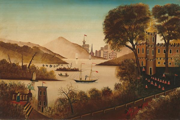 Curator: Well, the first thing that strikes me about this painting, *Lake George and the Village of Caldwell*, thought to be by Thomas Chambers, mid-19th century, is the sort of dreamlike quality it possesses. Editor: It’s undeniably charming in its naivety. Look at the pronounced brushstrokes and somewhat simplified forms. It's definitely got a homemade quality. Were these canvases mass-produced at this time? Were they using pre-mixed paints, or grinding their own pigments? That texture suggests an interesting physicality to the painting's production. Curator: Interesting points. From an art historical perspective, Chambers is associated with the Hudson River School, though he departs significantly from its more academic, classically informed conventions. His work certainly embraces a different kind of American vision, wouldn’t you agree? Consider the politics of landscape in that era and how idealized and pastoral scenes reinforced a certain national identity. Editor: Right, it’s a far cry from a Bierstadt. The almost folk-art quality complicates those grand narratives, perhaps inadvertently challenging those established artistic hierarchies. Those slightly wonky houses, that rather stout church steeple…It’s not grandiosity we are observing; it is the materials that provide the foundation for the buildings and that small sailboat gliding across the lake. I am sure that painting such scenery fed directly into regional tourism too. Curator: Absolutely. There’s also a powerful element of promotion happening. These images helped shape perceptions of these developing regions, encouraging both settlement and leisure travel. And how accessible and approachable would that particular style have seemed? Editor: Exactly! The materiality of both the paint and the scene feel down to earth, don’t they? We see the impact of the industrial revolution from an entirely different vantage. More ordinary, even… and made accessible as both a subject of paintings and something you could do on the Lake yourself. Curator: That’s such an astute observation. It brings into focus how art functions as an active participant in broader socio-economic shifts. So much more than pretty picture. Editor: It always comes back to how something is *made* doesn't it? Whether it's paint or progress. Thanks for letting me ramble about manufacturing today. Curator: My pleasure.
