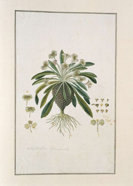 Curator: Oh, how lovely, it's like peering into a meticulously kept botanical journal. There's such delicate precision to it! Editor: Indeed. We're looking at "Scilla peruviana," or giant squill, rendered in watercolor, gouache, and colored pencil by Hans Simon Holtzbecker sometime between 1649 and 1659. What strikes me immediately is the bulb. It feels so earthy, almost vulnerable beneath the flourish above. Curator: Yes, vulnerable! That's it. There's something so profoundly human about it, laid bare as it is, contrasting so dramatically with the explosion of ordered beauty above. Holtzbecker really captured the plant's life cycle in a single image, didn't he? From the hidden potential to its dazzling display. Editor: Precisely. And in a time defined by exploration and colonial expansion, these botanical illustrations were tools of power. They document and categorize, creating a visual archive that's both scientific and deeply implicated in imperial projects. It makes me think about ownership and knowledge. Who gets to name things, to claim them, to define their value? Curator: Hmm, yes. There's also a simple love of observation here. I find myself lost in the gradients of green in those leaves, or the way each tiny floret in the bloom has its own character. He's really trying to communicate the essence of the plant, don’t you think? To show us how magnificent even a common flower can be? Editor: I agree. And thinking of its current home here at the SMK, it makes you consider how images like this circulate, accruing new layers of meaning. Is it still tethered to its original context, or has it taken on a life of its own, speaking to contemporary concerns about biodiversity, conservation, and our relationship to the natural world? Curator: That's beautifully put. It does feel like a bridge between centuries, reminding us both of humanity's drive to classify and control, and of our inherent capacity to see beauty in the small, quiet moments. Thank you for bringing such fascinating perspectives. Editor: Thank you, this piece really makes you ponder art's many complex lives across time, and reminds us that images, even the most seemingly simple ones, hold immense power.
