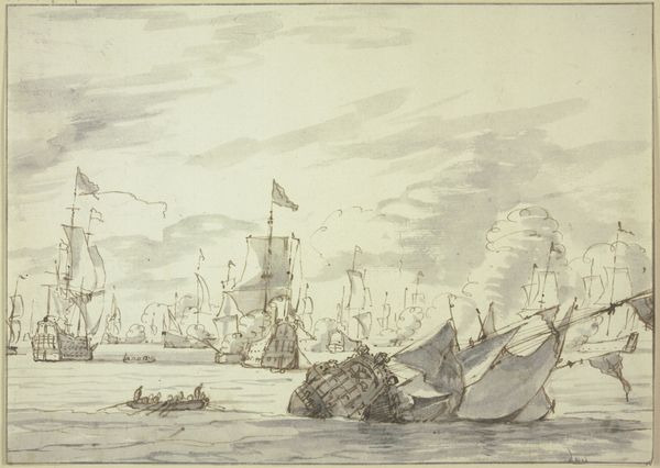 Editor: This is Willem van de Velde the Elder’s "Gevechten tijdens de eerste dag van de Vierdaagse Zeeslag, 1666", created in 1666. It's an ink and pencil drawing depicting a naval battle. The monochromatic palette creates a somber mood. I’m struck by the sheer number of ships and the chaotic composition. How would you approach interpreting this work? Curator: The drawing's materiality speaks volumes. Van de Velde was embedded within this conflict – quite literally at sea. Think about the immediate physical labour involved in creating a record, a depiction of naval engagement in media that can be translated for popular consumption on land. What impact do you think using readily available, transportable materials like ink and pencil has on its message? Editor: It makes the event feel accessible, almost journalistic in its immediacy. The sketch-like quality makes it seem as though he captured the scene live as it was happening. Curator: Exactly. And this accessibility directly informs how war – or rather, images of war – become part of the social consciousness. What happens when warfare transitions from an experienced event to a commodity of representation and consumption? Editor: I hadn’t considered that. So, the value isn’t just in the historical documentation, but also in how it transforms the act of war into something that can be processed and consumed by the public? Curator: Precisely. And this points us to the crucial labor behind shaping public opinion – both van de Velde’s as an artist, and the sailors involved in a manufactured theater of political domination on the seas. What sort of narratives do you think such controlled accessibility create? Editor: Wow, that gives me a lot to think about – it's no longer just a historical document but also evidence of a propaganda machine in action, crafted with accessible materials. Curator: Indeed. By focusing on its materiality and context, we've revealed its role beyond just depicting a naval battle.