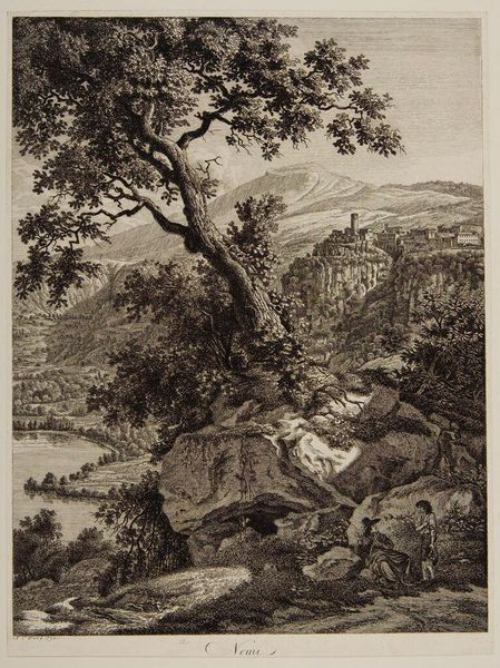Curator: Franz Kobell, born in 1749, presents us with "Rocky Landscape with Hagar and Ishmael," a work that draws us into its detailed world. Editor: There’s a distinct feeling of isolation here, a stark vulnerability in this natural setting. The contrast between the figures and the overwhelming landscape is compelling. Curator: It's fascinating how Kobell situates this biblical narrative within a specific visual language. Consider the power dynamics at play: Hagar, a woman cast out, embodies displacement and resilience. Editor: Absolutely, and the landscape itself acts as a character, reflecting her emotional state. The rocks and trees seem to mirror the harshness of her circumstances. Are we meant to read this landscape as inherently unwelcoming? Curator: Perhaps, or as a space of potential, a place for reimagining identity outside societal constraints. Hagar’s story resonates with contemporary struggles for autonomy and the re-negotiation of power within patriarchal structures. Editor: Indeed, viewing it through that lens makes the image far more potent. Curator: It’s in understanding the layers of historical and social context that the work truly comes alive. Editor: Agreed. It’s a reminder of art's capacity to spark ongoing dialogue.