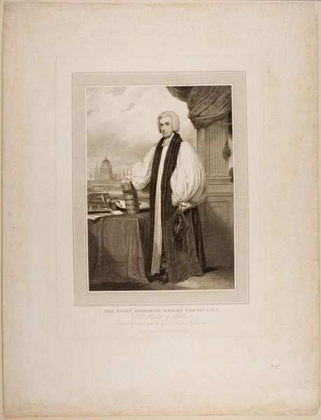 Editor: This is Charles Rolls' "Portrait of Benjamin West." It's interesting because it’s a portrait of an artist by an artist, but it feels quite formal. What strikes you about this piece? Curator: I find myself pondering the artist's hand here, both literally in Rolls' technique and metaphorically in West's own creative process. See how West seems to be stepping out of his world, beckoning us to join him, to see through his eyes, to feel the pulse of creation? What do you make of his gesture? Editor: It seems like he's inviting us into the painting, or perhaps explaining his process. Curator: Precisely! It's like he's saying, "Come, let's make art together," a generous invitation across time. I'm wondering, what does it mean to be seen, interpreted, and then re-presented by another artist? Editor: That’s a good point, there are layers of interpretation at play here. Curator: Absolutely. It’s a glimpse into not just a person, but the very soul of artistry, wouldn't you agree? Editor: I do. It's fascinating how much it makes you think about the artistic process.