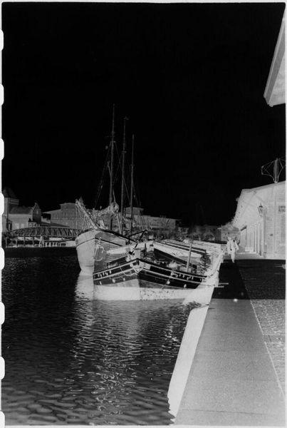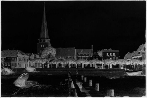 Curator: At first glance, this small, inverted photograph evokes a sense of eerie calm, don't you think? Editor: Absolutely. We are looking at a print attributed to Laurence Feininger, titled "[Beached boat near Lübeck]". The photograph's dimensions are remarkably small, only 2.5 by 3.5 cm. Curator: The inverted tones cast such a melancholic light upon the boat. The stark contrast highlights the textures, almost emphasizing the boat's stillness. I wonder about boats as symbols of journeys or transitions, what does a boat on land communicate? Editor: Indeed. It's tempting to consider the socioeconomic realities inherent in seafaring and boat construction at the time. The labor, the materials sourced... the boat is a product of its own historical forces. Curator: A fascinating point! I remain drawn to the image of the church in the background. It feels protective, watching over the grounded vessel. It connects this scene to centuries of faith and maritime tradition. Editor: A fruitful exchange, certainly. I find my focus constantly drawn back to the physical processes that brought this image into existence. Curator: Perhaps we can both appreciate the image’s lasting power to stimulate such varied yet connected perspectives. Editor: A fitting summation of the photograph, I think.