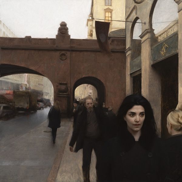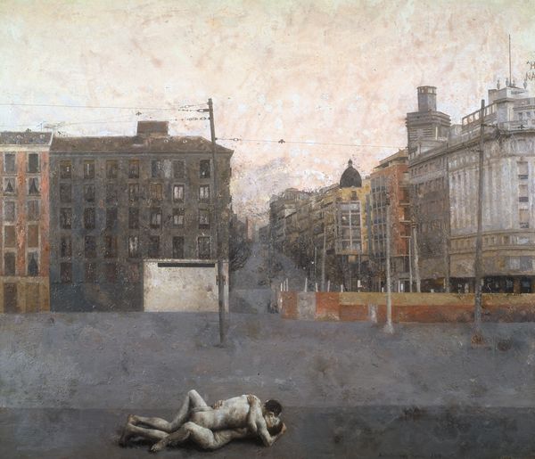 Editor: We’re looking at Nick Alm's 2019 painting, "Chrystal Plaza in Sunset", rendered in oil. It has a muted palette, all gentle browns and grays, punctuated by a sort of copper-green dome, and figures are crowded at the bottom. The overall effect is a somber urban tableau, but I’m not quite sure what to make of it. How do you interpret this work? Curator: Well, let's start by considering the figures at the bottom, emerging almost like shadows from the foreground. Given the painting's date, 2019, and its focus on a public space, doesn’t this grouping evoke ideas of urban anxieties? Who is seen, and who remains invisible? Editor: I see what you mean. The people in the front seem to be looking towards the light and they are more detailed, but those at the back almost fade away. Is it possible to link that to issues of class or visibility in cities? Curator: Absolutely. The figures literally closest to the viewer have distinct faces; they are granted a certain humanity, and yet there's a large shadowy anonymous mass surrounding them. Consider the architectural structure as a symbol of power and capital, observing the people from above; Alm presents a study of contemporary society: the loneliness of being trapped in systems we have little to no power to modify. Editor: So the sunset isn't romantic; it is casting a rather dramatic shadow. Do you see any hope for change within this? Curator: I appreciate that reading. Art like this poses questions; it doesn't necessarily offer simple answers. It makes you think about how individuals relate to urban life, economic disparities and how they can shape one's existence. Editor: It gives the title "Chrystal Plaza in Sunset" a bit of an ironic touch, reflecting back on consumer culture in late-stage capitalism, right? Curator: Exactly. The title is not descriptive, but suggestive. What is real, and what is illusion, constructed by those with power? Editor: That makes sense. Thank you. I will definitely never look at cityscapes in quite the same way now.