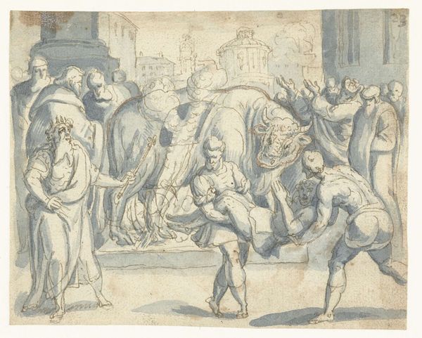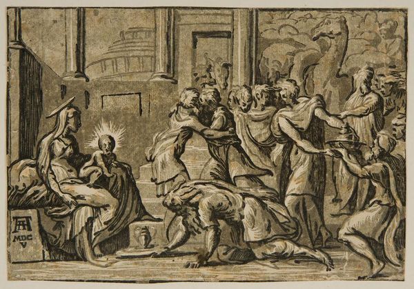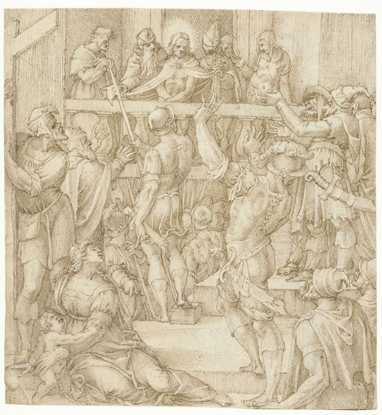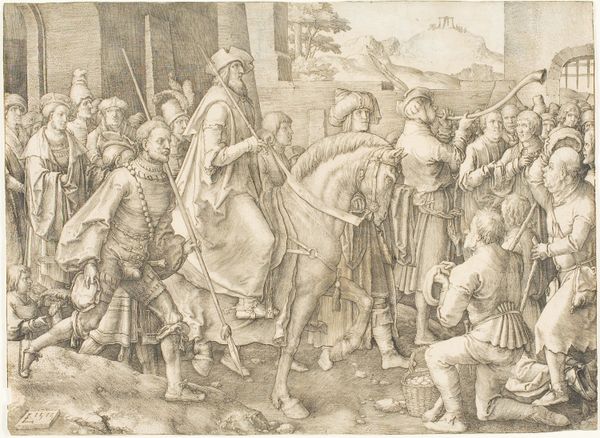Editor: This is Albrecht Dürer's "The Cross of Christ with Saint Veronica," created in 1520. It's a stunning engraving, filled with figures. I am struck by how much movement Dürer captures with seemingly simple lines. How do you read this emotionally and symbolically? Curator: It is indeed a masterful portrayal of the Passion. The engraving holds multiple layers of meaning, deeply rooted in cultural memory. Observe the figure of Veronica, holding the cloth imprinted with Christ’s face. It represents not just a physical act of compassion, but the very idea of sacred imagery. Editor: It seems like she's one of the few showing any compassion. What do the other figures represent? Curator: The soldiers, with their elaborate armor and expressions of cruelty, signify temporal power and the abuse thereof. The crowd, a chaotic mix of onlookers, represents the fickle nature of public opinion, the psychological phenomenon of collective behaviour. But let's consider the location... Does the architectural setting speak to you? Editor: It looks almost stage-like... are they observers? Curator: Precisely. This theatrical backdrop invites us, the viewers, to witness and perhaps even judge. Think about the enduring impact of this scene, depicted across centuries. Dürer wasn't merely illustrating a biblical event; he was engaging with the viewer, prompting reflection on themes of power, suffering, and redemption. What does the engraving teach us, would you say? Editor: It definitely makes you think about how easily people can become caught up in the moment, losing sight of empathy. It's more than just a historical depiction; it is a commentary on human behavior. Curator: Exactly! And by using symbols that resonate across time, Dürer ensured his message would continue to be potent for generations.
