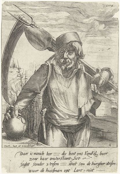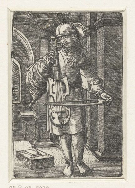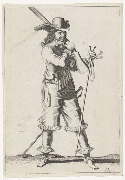 Editor: Here we have Theodor Matham’s “Man wijst naar glas in linkerhand,” an engraving from 1627, currently held at the Rijksmuseum. There’s almost a manic energy to this character; his expression and posture are… theatrical, I guess? What do you see in this piece? Curator: I see a rich tapestry of symbolism interwoven with societal commentary. The glass itself, prominently displayed, transcends its function. What does it represent in the context of 17th-century Dutch culture? Perhaps indulgence, merriment, or even the transience of earthly pleasures? Note the juxtaposition of the violin - a symbol of harmony and art - with the rather unrefined gesture and facial expression. Editor: So, there’s a kind of contrast happening? Between… refinement and something coarser? Curator: Precisely! Consider how this interplay reveals a deeper commentary on social classes, on ideals versus reality. Is he a court jester, a drunken musician, a satirical representation of the bourgeoisie? Or does it perhaps explore our emotional and psychological relationship with material culture. Editor: The glass, the violin… almost props in a performance? Curator: Indeed. Ask yourself, what narrative do these symbols create together? The gaze directed towards the glass -- does it hint at a fleeting joy, a dependence, a warning? Matham is inviting us to look deeper than just the surface-level representation of a man with a drink. Editor: That makes me think about how much an artist relies on existing cultural understandings to get their message across. Thank you! Curator: My pleasure, it’s always fascinating to uncover those layers and discover how much the past continues to speak to us.