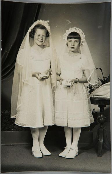 Editor: This is an untitled photograph by John Deusing, showing two girls in white dresses, veils, bibles and rosaries. It seems to capture a formal occasion, maybe a first communion. What stands out to you about this image? Curator: The image’s power lies in its material reality. Consider the labor invested in these garments. Who made them? Were they handmade or store-bought? These details reveal social and economic contexts beyond the immediate scene. Editor: That’s fascinating! I hadn't considered the garment production. Curator: Indeed. The rosaries and bibles are also commodities, produced and consumed within a religious framework. How does this influence your interpretation? Editor: It makes me think about the commercialization of religion and the roles these objects play in reinforcing beliefs. Thanks, I'll never look at a photograph the same way. Curator: And I will remember to look beyond the surface for the human element of the subject.