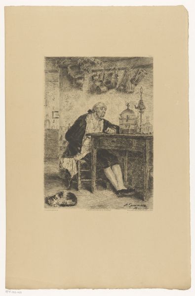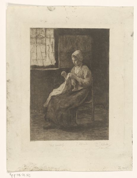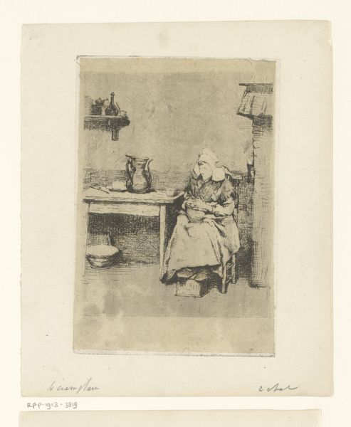 Editor: This is "Interior with Peeling Peasant Woman" by Piet Verhaert, an etching from 1879. The woman looks really absorbed in her task, but the whole scene feels a bit melancholy and sparse. What symbols or meanings do you see woven into this scene? Curator: The peasant woman, situated within a simple domestic space, carries echoes of centuries of rural life, right? The act of peeling, seemingly mundane, hints at ideas of transformation and revelation. But it also has an enduring echo of sustenance and labour, her work perhaps underappreciated yet utterly vital. The objects around her – the pitcher, the simple table –speak to a quiet resilience. Editor: Transformation, that’s interesting. Do you think Verhaert was making a specific statement about women's roles? Curator: Perhaps. Peasant women often embody notions of hard work, family, and connection to the land. Does the subdued atmosphere here invite reflection on the social conditions or emotional burdens of such lives? Or is it also pointing toward an interior world? Look how the light delicately falls upon her face... Editor: I see what you mean. The etching feels intimate despite its focus on everyday work. What lasting impressions do you get from those specific details? Curator: It’s a reminder that art often finds significance in the everyday, and in doing so elevates the dignity of those often unseen, like the rural working class. Verhaert created a moment that reflects a timeless existence that touches us all, on some level. Editor: Absolutely. I hadn't considered the deeper symbolic meaning behind something as simple as peeling. Thanks for showing me what's behind these visual traces of her daily existence.