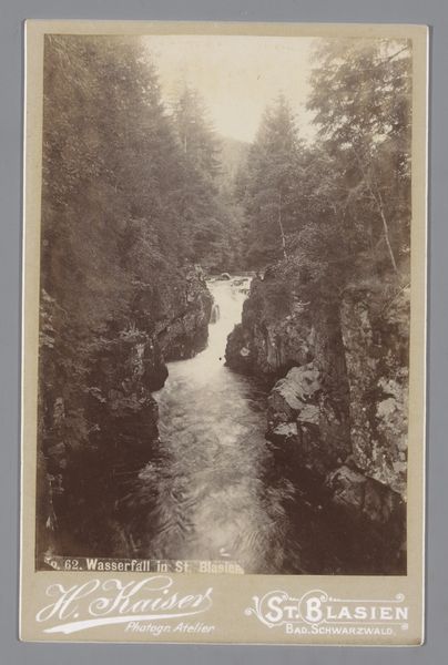 Editor: Here we have William Henry Jackson’s “Westzijde van Eagle River Canyon in Colorado,” an albumen print dating somewhere between 1860 and 1900. I find it quite evocative—it has this real sense of scale and wildness, despite its relatively small size. What do you see in this piece? Curator: I see a dreamscape, or maybe a memory. That soft-focus river feels almost like a flowing ribbon of time, doesn’t it? It really reminds me of the Hudson River School painters—they had a way of idealizing nature, didn’t they, capturing it just as the wild west was facing down modern America. This canyon feels caught between those worlds, between something being remembered, and something becoming… Editor: Like a time capsule? Curator: Exactly! The textures—the rocky slopes, the stark trees—it's like Jackson is showing us the very bones of the continent. Have you ever felt that when you're really in the wilderness? Editor: Definitely. A sense of ancient, almost geological time. And a kind of lonely beauty. Curator: Beautifully put. That albumen print gives it that almost sepia-toned sense of history as well. He wanted you to feel like you were THERE. He trekked across the country. A little dramatic license here and there to catch the viewers, but very brave. So I'm curious: what does this 'wildness' actually tell *you*? Editor: It makes me think about preservation. Of both land and memory. Curator: And it asks you the crucial question, right? What wilderness can we find, that we keep and preserve for our children?