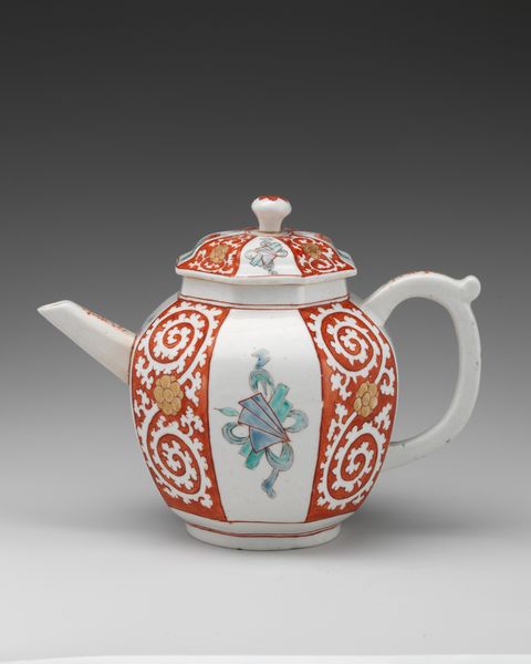Editor: This is the “Teapot with storks,” crafted sometime between 1730 and 1745. It's porcelain from Chantilly, a ceramic sculpture actually. What a delightful piece of decorative art! It feels so light and whimsical to me, almost like it belongs in a fairy tale. What jumps out at you when you see this teapot? Curator: Whimsical, yes! It has a carefree spirit. The dancing storks immediately grab my attention, like a playful ballet frozen in porcelain. But let’s zoom out. It's French porcelain mimicking Chinese designs— a fashionable affair at the time! Do you notice how the artist adopted Chinese motifs and palettes? Editor: Now that you mention it, I see that in the color choices, but also those stylised plants that do feel distinctly Asian inspired. So, it’s like a French artist’s interpretation of Chinese art, all on a teapot! Were these types of items mostly for show or practical use back then? Curator: Both, really! Though let’s be honest, sipping tea from this would’ve been a rather luxurious affair. More about displaying status and refined taste, wouldn’t you say? I can imagine ladies in powdered wigs clinking cups around a table, discussing… what, fashion? Revolution? Stork gossip, perhaps? Editor: I love that image! This teapot seems far more interesting now, knowing all this. It's not just a pretty object; it tells a story about trade, artistry, and high society. Curator: Precisely! Isn’t it wonderful how a simple teapot can contain a whole world?