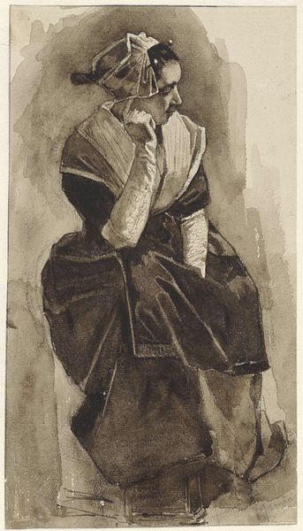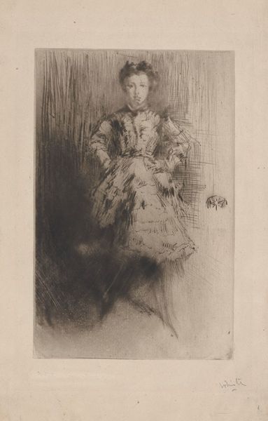 This is Wanda Miller Matthews’s Self-Portrait, a monochrome print. Matthews came of age in the middle of the 20th century, during a period of significant social change and evolving gender roles. The portrait shows a woman, presumably the artist, in what appears to be a moment of contemplation. She stands with her hands clasped, her gaze direct yet soft, creating a sense of intimacy. The monochrome tones and use of light and shadow add depth and a sense of introspection to the piece. There is an emotional subtlety to the work that resists traditional, idealized representations of women. It acknowledges the complexities of female identity and invites viewers to consider the multifaceted nature of self-perception, while capturing a sense of quiet strength and resilience.