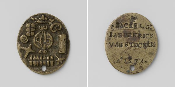 Editor: Here we have an intriguing bronze relief dating from somewhere in the 18th century. It's titled "Collegium Medicum te Amsterdam, toegangspenning voor de hortus medicus voor leerling G.J.B," which I think translates to something about a medical college in Amsterdam, and it seems to have been an admission token to a botanical garden for a student. The design is ornate and dense. What is your initial impression of the piece? Curator: Observe the bilateral symmetry deployed on the token’s obverse. The central urn or vase commands visual prominence, its surface a locus of concealed signification. Flanking it are seemingly organic forms, their textures meticulously rendered. Do you perceive a tension between the implied three-dimensionality of the relief and the undeniable flatness of its medium? Editor: I do, now that you mention it. The detail on such a small surface is impressive, but there's a kind of visual flattening that keeps it contained. What’s the effect of the shape itself, being a circle? Curator: The circular format, reminiscent of ancient coins or medals, introduces an element of classical formalism. Its boundaries emphasize the composition's internal arrangement. The lack of a traditional perspectival space forces the eye to reconcile planes and engage with the symbolism embedded within the arrangement. What, to your eye, does this arrangement seem to convey? Editor: I'm not entirely sure; I guess a controlled chaos? The images fight the token. I do notice that the lettering, "G.J.B" and other images, has almost effaced the other side! Curator: A point well taken. It is through deciphering these relationships, by recognizing how they play within a theoretical system of aesthetics, that the intrinsic value of such work may emerge. Your observation concerning the effaced nature speaks to entropy and time's immutable inscription upon even the most durable artifacts. Editor: That gives me a lot to think about. Looking beyond the simple design of the token reveals far more complexity and thoughtfulness. Curator: Precisely. A semiotic consideration helps unravel many intricacies present within this "minor" art form.